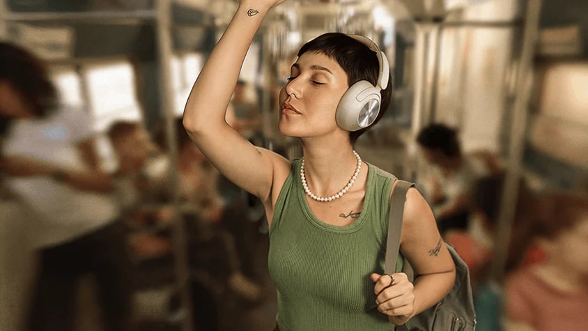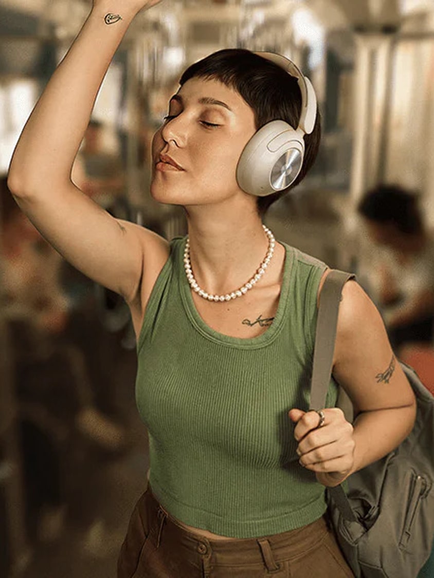 Le système Hybrid Active Noise Cancelling se déclenche en appuyant sur le bouton ANC situé sur le panneau de commandes de l’oreille droite. Juste en dessous, on trouve le bouton pour allumer ou éteindre le casque, les boutons + et - pour régler le volume, ainsi que le port USB-C permettant de recharger le casque ou de l’utiliser en mode filaire. Les petits trous visibles sur les oreillettes sont les micros ENC. Il y en a 5, et ils sont conçus pour isoler la voix de l’utilisateur des bruits ambiants lors des appels ou des enregistrements.
